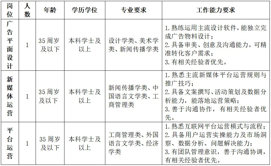 - 1.報名時間:自發(fā)布之日起至2025年8月13日16:00止,逾期不予受理報名。 - 2.報名方式:將個人簡歷、身份證、學(xué)歷學(xué)位證書及相關(guān)作品等資料以 PDF 格式發(fā)至指定郵箱,郵件主題標(biāo)注“應(yīng)聘 XX 崗位 + 姓名”。 - 3.資格審查:審查通過者進(jìn)入考試環(huán)節(jié),考試時間、地點及形式另行通知,請保持通訊暢通。