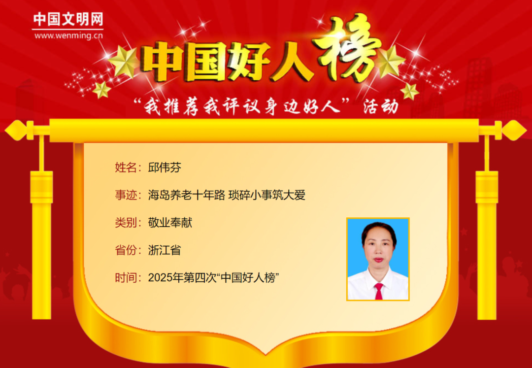 邱偉芬是岱山縣長涂鎮(zhèn)殘疾人居家安養(yǎng)聯(lián)絡(luò)員,自投身海島養(yǎng)老事業(yè)起,十年如一日踐行“助人即樂己”的奉獻精神,以平凡之軀書寫新時代雷鋒故事。